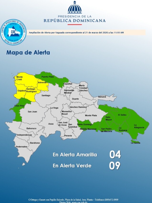 El Centro de Operaciones de Emergencias (COE) aumentó este sábado a 08 provincias, más el Distrito Nacional, en alerta verde y mantiene 04 provincias en alerta amarilla debido a un sistema frontal y su vaguada asociada en el noroeste del...